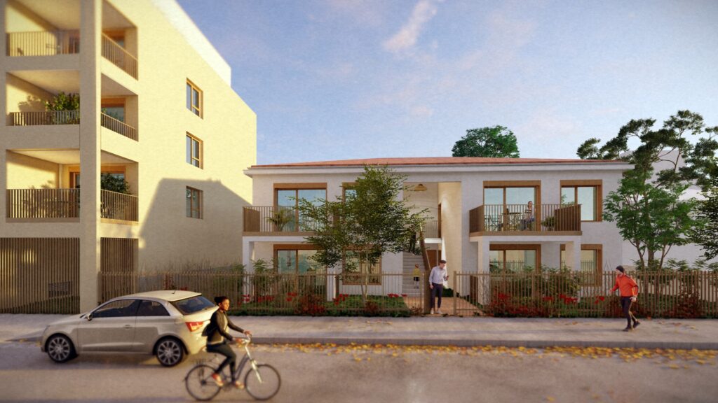 La résidence se compose de quatre bâtiments organisés autour d’un jardin commun paysagé, véritable oasis urbaine dotée d’un espace de jeux convivial, d’un verger et d’une placette propice à la détente et à la reconnexion avec la nature.